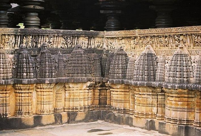 The rows of shining lathe turned pillars that support the ceiling of the mantapa is a Hoysala-Chalukya decorative idiom.[8] The mantapa has many deeply domed inner ceiling structures adorned with floral designs. The outer parapet wall of the open mantapa has a total of hundred and forty panel sculptures with depictions from the Hindu epics. Unlike many Hoysala temples where the panels are small and carvings in miniature, these panels are comparatively larger. The Ramayana is sculpted on the south side wall on seventy panels, with the story proceeding quite unusually, in anti-clockwise direction. On the north side wall, all depictions are clockwise, a norm in Hoysala architectural articulation. Twenty five panels depict the life of the Hindu god Krishna and the remaining forty five panels depict scenes from the epic Mahabharata.
