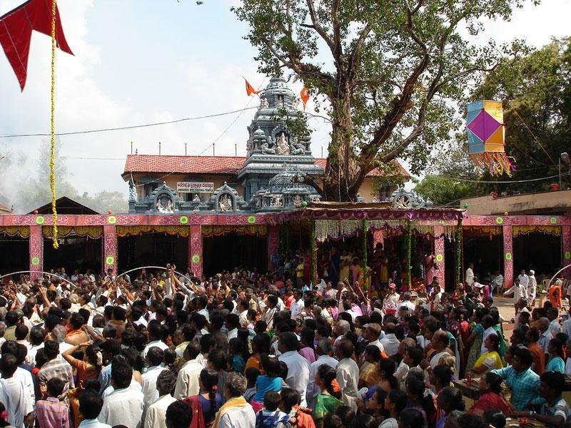 Ganesh Chaturthi is the main festival celebrated at Anegudde temple and Sankashta Chaturthi is also celebrated with great devotion. On the Chauthi / Chaturthi (the 4th day after the full moon) of every lunar month, special poojas are held at the temple. Devotees frequently perform several poojas and take prasadam at this temple. As myths run, a devotee (Vishweshwara Upadhyaya) was living here, regularly worshipping Lord Ganesha. One day, a Brahmin Vatu (young boy) appeared in his dream and said that he was hungry. Taking Upadhyaya with him, the Vatu disappeared near a stone in Nagachala. Getting surprised by this unusual dream, he started off on the next morning in search of the spot, where the Brahmin boy disappeared in his dream. It was his usual path, which led to a pond, where he used to take his bath, bring sacred water for Abhishekam and collect flowers for worshipping Lord Ganesha. Soon he found the same granite stone, which he witnessed in his dream and was covered by wild flowers giving it a divine appearance. Impressed by this sight, Upadhyaya hurriedly took his bath in the nearby pond and worshipped the deity and offered wild flowers and fruits. He continued to do so for a long time. One day, he saw a cow standing there pouring in milk from her udder on the deity. After this incidence, his devotion became stagnant and worshiped his God with more devotion. People generously donated land on which a straw hut was constructed to enable Upadhyaya to continue his worship. Thus started a new tradition of worship at Kumbhashi, which did not stop at any stage.