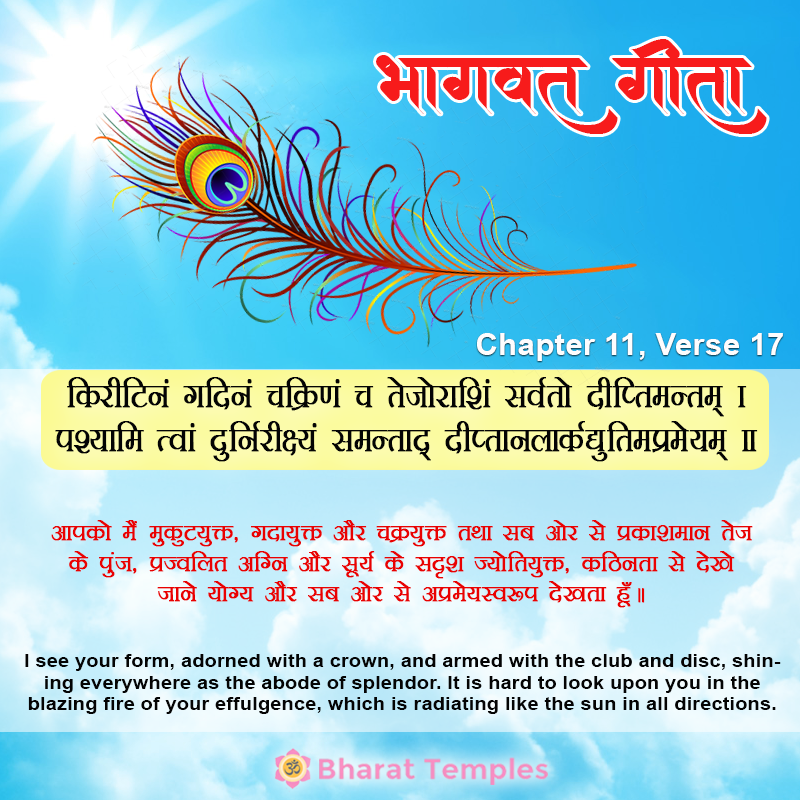I see your form, adorned with a crown, and armed with the club and disc, shining everywhere as the abode of splendor. It is hard to look upon you in the blazing fire of your effulgence, which is radiating like the sun in all directions.
