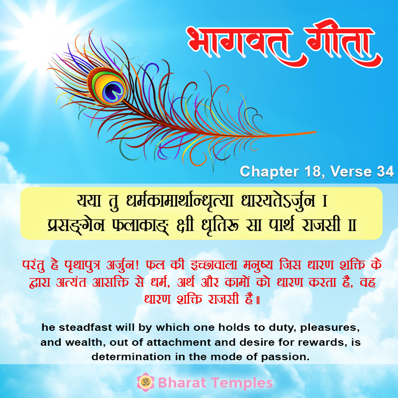 18.34 Tu, but, O Partha; the dhrtya, firmness; yaya, with which; a person dharayate, holds on to; dharma-kama-arthan, righteousness, covetable things and wealth-entertains the conviction in the mind that these ought to be pursued always; and becomes phala-akanksi, desirous of their fruits; prasangena, as the occasion for each arises, according as the situation arises for holding on to any one of dharma etc.; sa, that; dhrtih, firmness; is rajasi, born of rajas.