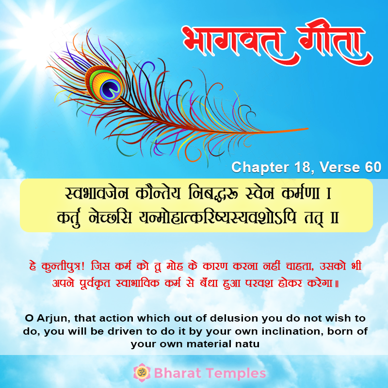 18.60 And because of nibaddhah, being securely bound; svena, by your own; karmana, duty; svabhavajena, born of nature [Svabhava means those tendencies which are created by good bad actions performed in previous births, and which become the cause of performance of duties, renunciation, experience of happiness, sorrow, etc. in the present birth.-S.]-herosim etc. as stated (in 43); O son of Kunti, you avasah, being helpless, under another’s control; karisyasi api, will verily do; tat, that duty; yat, which duty; you na, do not; icchasi, wish; kartum, to do; mohat, owing to indiscrimination. For,