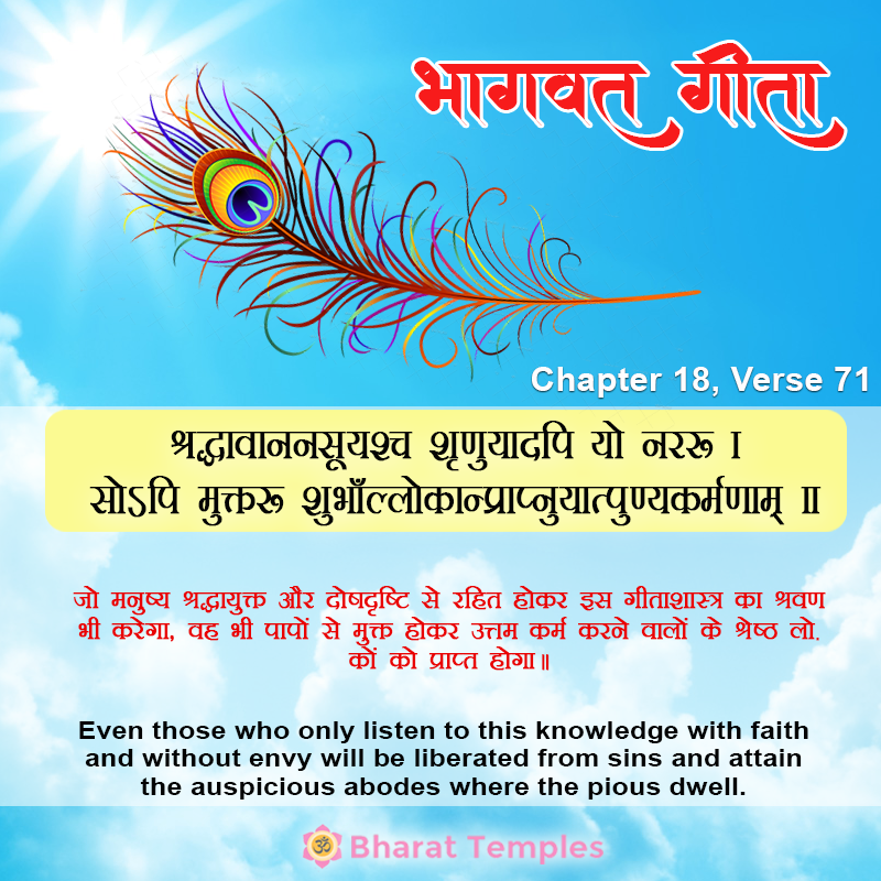 18.71 Yah narah, any man who; being sraddhavan, reverential; and anasuyah, free from cavilling; srnuyat api, might even hear this text-the word even suggests that one who knows the meaning (of the Scripture) hardly needs to be mentioned-; sah api, he too; becoming muktah, free from sin; prapnuyat, shall attain; subhan, the blessed, auspicious; lokan, worlds; punya-karmanam, of those who perform virtuous deeds, of those who perform rites like Agnihotra etc.