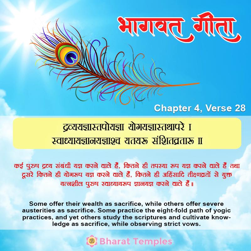 Some offer their wealth as sacrifice, while others offer severe austerities as sacrifice. Some practice the eight-fold path of yogic practices, and yet others study the scriptures and cultivate knowledge as sacrifice, while observing strict vows.