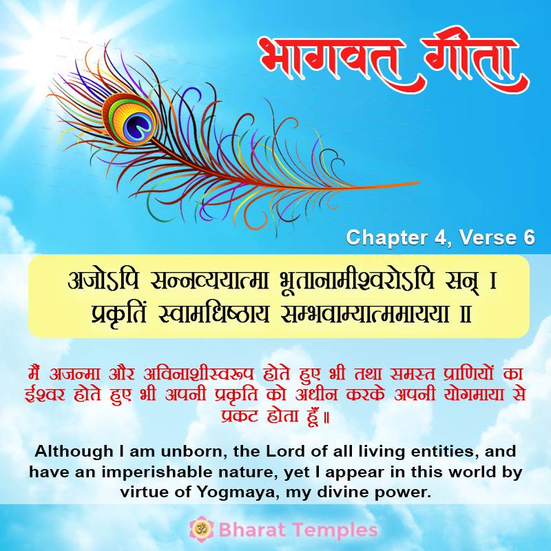 Although I am unborn, the Lord of all living entities, and have an imperishable nature, yet I appear in this world by virtue of Yogmaya, my divine power.
