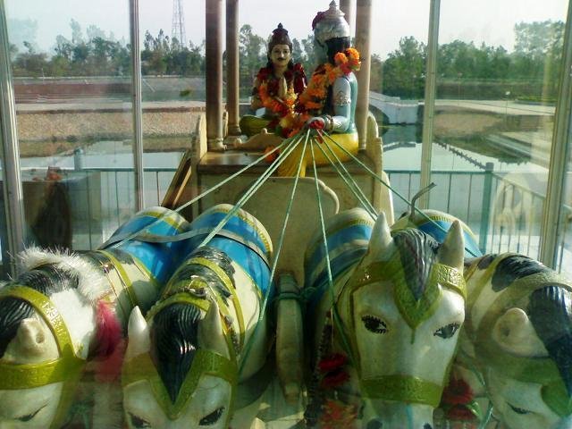 A marble chariot depicting Krishna delivering the sermon to Arjuna marks the site of the Srimad Bhagwad Gita. In one secluded section of this center, an old Shiva temple can also be seen. Hundreds of years ago, a holy water tank was present here and it can still be seen in the rainy season. The Kurukshetra Development Board has renovated the site in recent times. A mango shaped lake has been constructed here with covered bathing ghats for ladies. Cement parapets and enclosures have been built for protection. A light and music show is organized by the tourism department at the site, on a regular basis, which recreates episodes from the epic Mahabharata. A restaurant and accommodation wing for pilgrims have been built and the entire area has been landscaped with flowering bushes and eucalyptus trees.