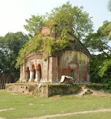 A temple was built at the site in 1651 AD by Mukundaprasad Roychowdhury, a family mamber of the “Roy Zamnidars” of Samta. Also known as Gopaler Mondir, the temple is a large, beautiful, terracotta ornamented, dilapidated temple of Radha & Madangopal Jiu (Radha & Krishna). This temple is one of the largest aat-chala (roof with 8 slopes) temples in Bengal. Main entrance with three arches is on the south face. Two additional entrances, one each on the west and east faces.