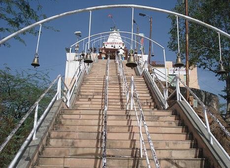 Neemach Mata Temple is located on a hill on the banks of the Fateh Sagar Lake in the city of Udaipur, Rajasthan. This temple is located on a green hill in the Dewali (pronounced Dey-vaa-lee) area of Udaipur. It has both stairs and uphill slope walk way to climb, which is around 900 metres long. It enshrines the stone idol of Neemach Mata Devi. There is also an idol of Lord Ganesh and three west-facing lions of stone.