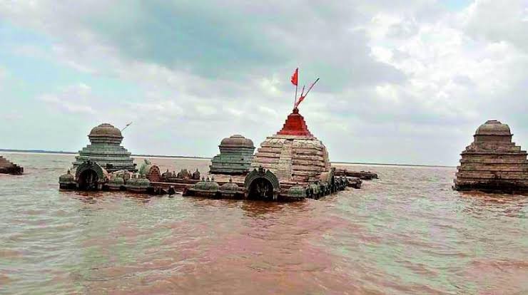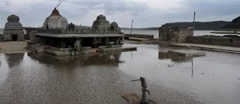 The Sangameswara temple is a Hindu temple in the Kurnool district, Andhra Pradesh, India. It is located near Muchumarri at the confluence of the Krishna and Bhavanasi rivers, in the foreshore of the Srisailam reservoir where it is submerged for part of the time, surfacing when the water level recedes to a sufficient degree.It was first submerged after the Srisailam Dam was constructed in 1981, and first surfaced in 2003
