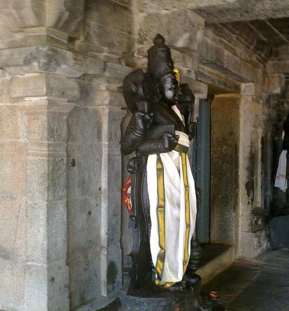 While this is not a Divya Desam, there are some interesting connections with Tirupathi and Oppiliappan Divya Desams. One finds Tirupathi Lord’s Conch and Chakra at this temple. Similar to Oppiliappan temple, Lord Srinivasa is said to have provided darshan to Markandeya Rishi (as Ranganatha in his Sayana Kolam) and to Bhoodevi as Kannan. Hence, Markandeya Rishi and Bhoo Devi are seen by the side of Appan Venkatesan.